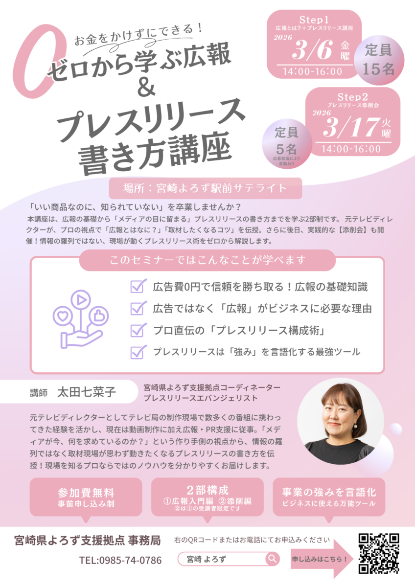 | お問い合わせ | 宮崎県よろず支援拠点 事務局 平日9時~17時(12時~13時を除く) 電話:0985-74-0786 |